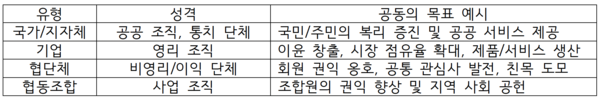 국가, 지자체, 기업, 협/단체, 협동조합 등은 모두 조직이다. 조직은 공동의 목표를 달성하기 위해 여러 사람이 모여 체계화된 구조를 가지고 상호작용하는 사회집단으로 정의된다.