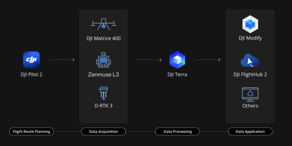 Zenmuse L3는 DJI 엔터프라이즈 생태계와 완벽하게 통합되어 데이터 취득부터 처리, 활용까지 전 과정을 아우르는 통합 매핑 솔루션을 제공한다. D-RTK 3 다기능 스테이션, DJI Pilot 2, DJI Terra, DJI Modify, DJI FlightHub 2와 연동하여 복잡한 다중 플랫폼 구성을 단일 워크플로우로 단순화한다. 이로써 보다 간편하게 운용하고 빠르게 사용법을 익힐 수 있으며, 다양한 매핑 작업을 효율적으로 수행할 수 있다.