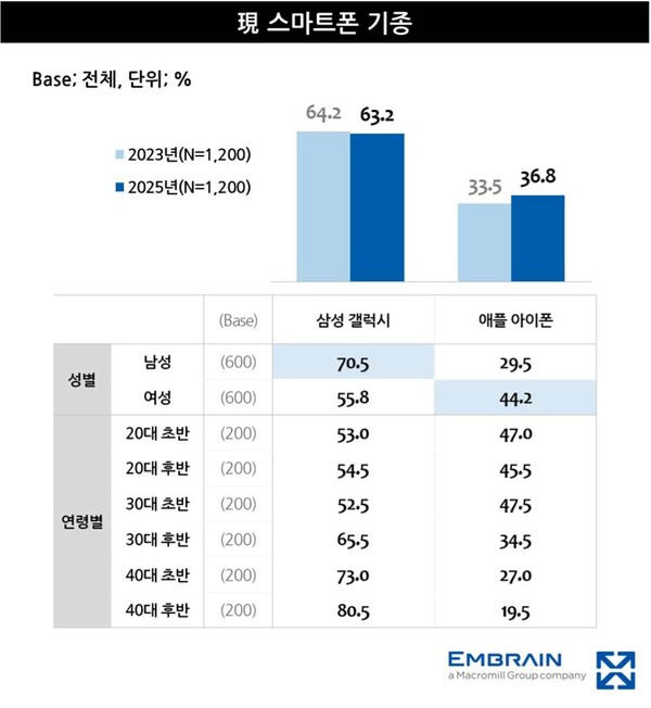 現 사용 스마트폰, "갤럭시(63.2%) vs 아이폰(36.8%)"... 성별·연령별로 스마트폰 ‘선호 기종’ 차이 큰 편