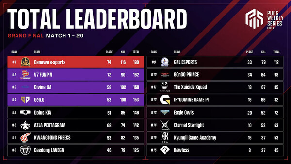 이번 그랜드 파이널은 마지막 날까지 결과를 점치기 어려울 정도로 치열한 우승 경쟁이 펼쳐졌다. 그랜드 파이널 3일차까지 선두권을 지키던 디플러스 기아, 디바인 티엠, 젠지가 잠시 주춤하는 사이 다나와 이스포츠가 마지막 날인 4일차에 특유의 강력한공격력과 안정적인 운영 능력을 선보였고, 마지막 매치 19과 매치 20에서 연이어 치킨을 2회나 획득하며 끝내 우승 팀이 됐다.