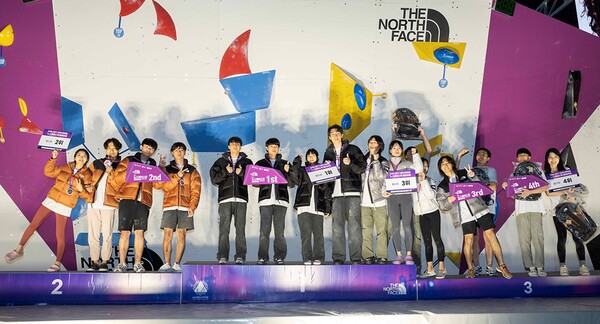 엔데믹을 맞아 4년 만에 재개된 ‘제27회 노스페이스컵 전국 스포츠클라이밍대회’는 4.5m 높이의 암벽에 설치된 다양한 인공 구조물을 4분동안 로프 없이 맨 몸으로 오르며 주어진 과제를 해결하는 ‘볼더(Boulder)’ 종목으로 진행됐다. 국내 스포츠클라이밍 저변 확대와 우수 선수 발굴 및 대중화에 기여하고자 개최된 이번 대회에는 동호인 선수들이 열띤 경쟁을 펼친 끝에, ‘투플한우’팀이 ‘도미노’팀을 제치고 1위를 차지했다.