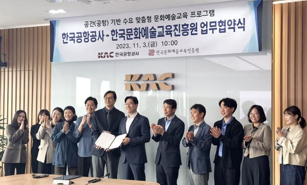 한국문화예술교육진흥원(원장 박은실, 이하 교육진흥원)과 한국공항공사(사장 윤형중, 이하 공항공사)는 공간(공항) 기반 수요 맞춤형 문화예술교육 프로그램 개발 및 시범 운영을 위한 업무협약을 3일 서울 강서구에 위치한 한국공항공사에서 체결했다.