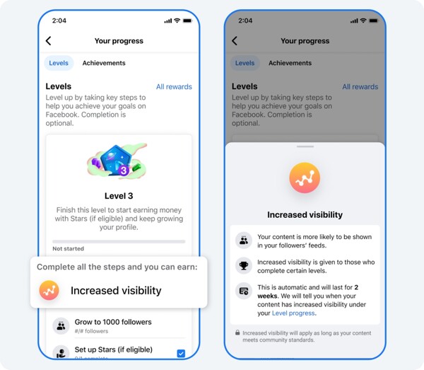 많은 관심을 불러일으킬 것으로 예상되는 새로운 인센티브를 도입한다. 메타는 "만 18세 이상의 크리에이터가 모든 진행 단계를 완료하면 피드에서 가시성을 높이거나 페이지 또는 프로필에 떠오르는 크리에이터 라벨을 표시할 수 있는 자격을 얻을 수 있으며, 두 가지 모두 더 쉽게 발견되는 데 도움이 될 수 있다."라고 밝혔다.
