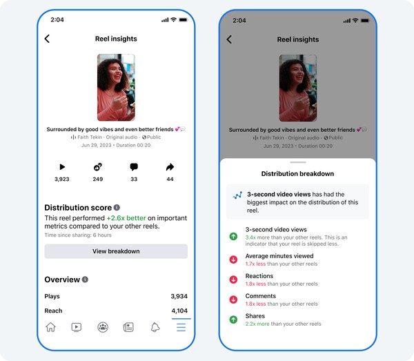 메타는 새로운 릴스 지표를 추가하고 팔로워와 비팔로워로 세분화된 릴별 도달 범위, 배포 점수, 리텐션 그래프 등 일부 기존 지표를 업데이트했다. 또한 릴스 재생에 대한 더 많은 인사이트를 추가하여 인게이지먼트를 더욱 맥락에 맞게 파악할 수 있다.
