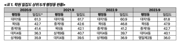 <표 1>에 따르면 20년부터 23년까지 대치1동에서 영업 중인 학원 업종 밀집도는 매년 60% 이상씩을 기록했지만, 연평균 0.3%씩 꾸준히 증가하고 있는 것이 확인됐다.(20년 9월 대비 23년 9월)