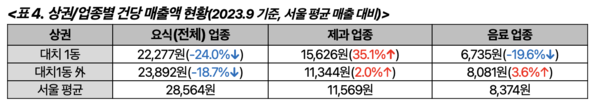 특히, 대치1동 등 학원 업종 밀집도가 높은 지역일수록 간단하고 빠르게 끼니를 해결할 수 있는 제과점 업종에서의 소비가 많아진 것이 확인됐다.(서울 전체 평균 대비 건당 매출액 35%↑) 반면, 제과점 업종에서 같이 구매 가능한 음료 등으로 인해 음료 업종의 건당 매출액은 낮아졌다.(서울 전체 평균 대비 건당 매출액 20%↓)