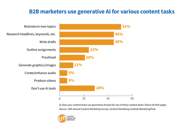 그렇다면 오늘날 콘텐츠 마케터들은 이러한 툴를 어떻게 사용하고 있을까? 약 절반(51%)이 새로운 주제를 브레인스토밍하기 위해 제너레이티브 AI를 사용다. 헤드라인과 키워드를 조사하고(45%) 초안을 작성할 때(45%) 툴를 사용한다는 응답도 많았다. 과제 개요 작성(23%), 교정(20%), 그래픽 생성(11%), 오디오(5%) 및 비디오(5%) 제작에 AI를 사용한다는 응답은 소수에 불과했다.