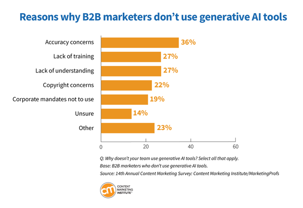 일부 B2B 마케터들이 제너레이티브 AI 툴을 사용하지 않는 이유는 무엇일까? 가이드라인이 부족하기 때문일 수도 있지만, 정확성 문제(36%), 교육 부족(27%), 이해 부족(27%) 등도 있다. 22%는 저작권 문제를, 19%는 회사에서 사용하지 말라는 지침이 있기 때문이라고 답했다.