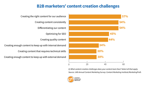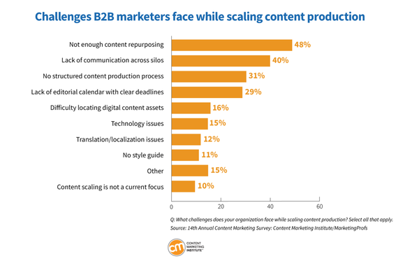 B2B 마케터가 콘텐츠 제작을 확장하는 과정에서 직면하는 어려움에 대해서도 질문했다. 거의 절반(48%)이 "콘텐츠 용도 변경이 충분하지 않다"고 답했다. 40%는 조직 내 사일로 간 커뮤니케이션 부족을 문제점으로 꼽았다. 31%는 '체계적인 콘텐츠 제작 프로세스가 없다'고 답했으며, 29%는 '마감일이 명확한 편집 캘린더가 없다'고 답했다. 10%는 확장에 현재 중점을 두고 있지 않다고 답했다. 그외 디지털 콘텐츠 자산을 찾기 어려움(16%), 기술 문제(15%), 번역/로컬라이제이션 문제(12%), 스타일 가이드 부재(11%)도 다른 장애물 중 하나로 꼽혔다.