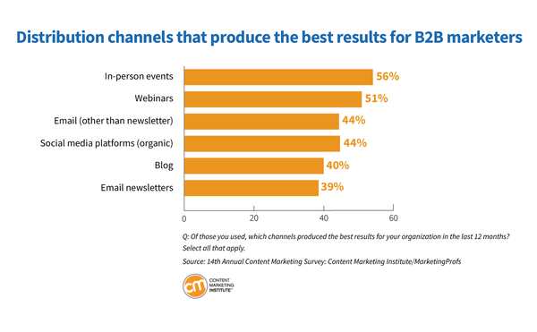 그렇다면 어떤 채널이 가장 효과가 좋을까? 설문조사에 참여한 대부분의 마케터는 대면 이벤트(56%)와 웨비나(51%)가 더 나은 결과를 낳는다고 답했다. 이메일(44%), 유기적 소셜 미디어 플랫폼(44%), 블로그(40%), 이메일 뉴스레터(39%)가 그 뒤를 이었다.