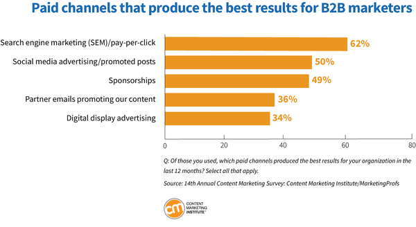 마케터들은 콘텐츠 홍보를 위해 86%가 유료 콘텐츠 배포 채널을 사용한다. 이 중 78%는 소셜 미디어 광고/프로모션 게시물을, 65%는 스폰서십을, 64%는 검색 엔진 마케팅(SEM)/클릭당 지불을, 59%는 디지털 디스플레이 광고를 사용한다. 네이티브 광고(35%), 파트너 이메일(29%), 인쇄 디스플레이 광고(21%)에 투자하는 비율은 훨씬 적었다.