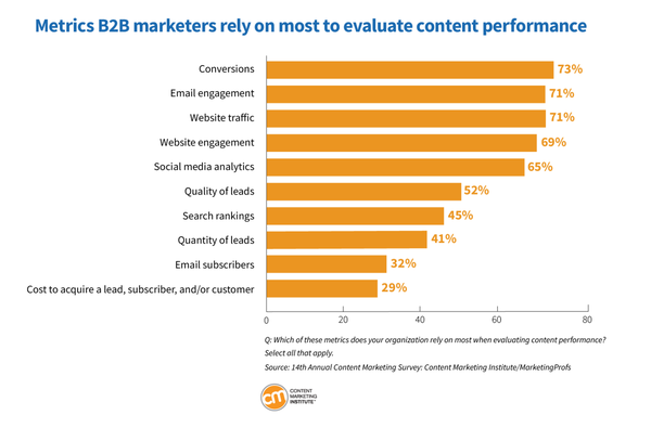 콘텐츠 성과를 평가하는 데 가장 자주 사용되는 5가지 지표는 전환(73%), 이메일 참여도(71%), 웹사이트 트래픽(71%), 웹사이트 참여도(69%), 소셜 미디어 분석(65%)이다. 약 절반(52%)은 리드의 품질을, 45%는 검색 순위를, 41%는 리드의 양을, 32%는 이메일 구독자를, 29%는 리드, 구독자 또는 고객 확보에 드는 비용을 추적한다고 답했다.