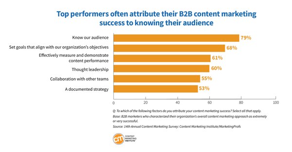 성공적인 마케터들이 가장 많이 꼽은 성공 요인은 오디언스를 파악하는 것(79%)이었다. 최고의 성과를 내는 콘텐츠 마케터들은 오디언스를 파악하여 해당 오디언스에 적합한 콘텐츠를 제작하는 것을 최우선 과제로 삼고 있다.