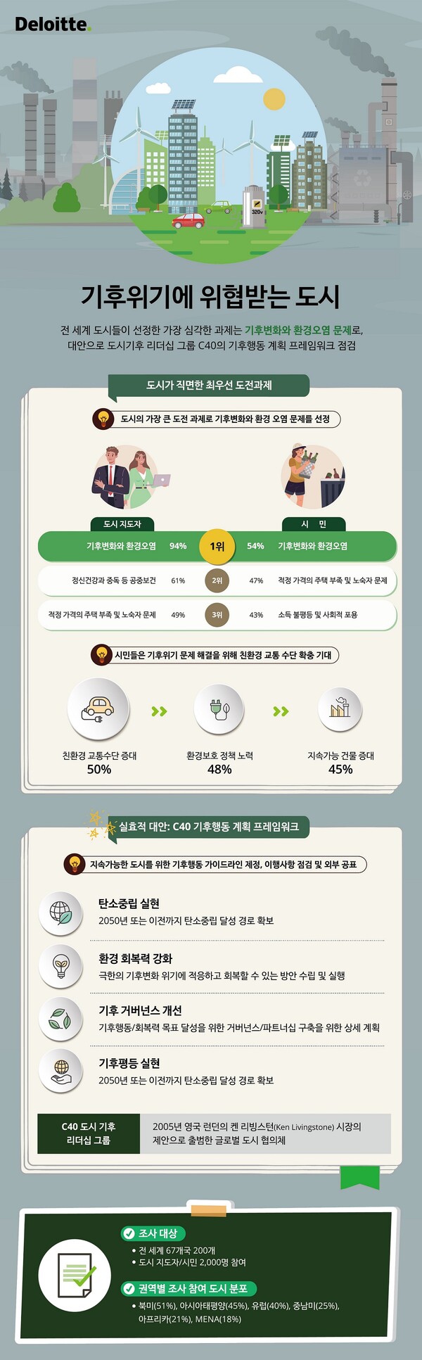 딜로이트-소트랩 공동 서베이는 2022년 12월 67개국 200개 도시 지도자 200명과 20개 도시의 시민 2000명을 대상으로 진행됐다. 이번 분석 보고서는 전 세계 도시들이 탄소 배출량 감축과 기후변화 대응을 위해 진행하는 활동을 심층 분석했다.