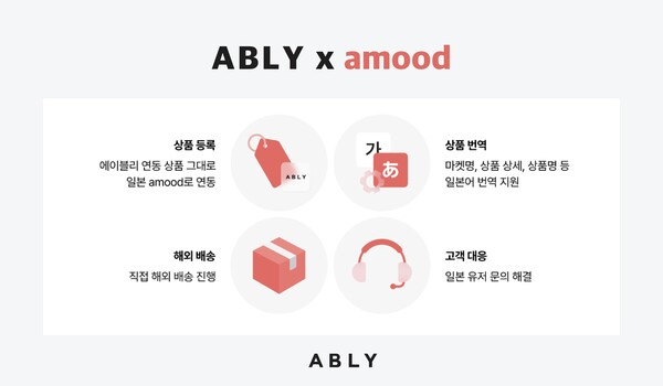 에이블리는 해당 솔루션을 에이블리 일본 쇼핑 앱 ‘아무드(amood)’를 통한 글로벌 진출 프로세스까지 확장하고 K 쇼핑몰의 해외 판로 개척 지원에 나선다. ‘에이블리 파트너스’ 셀러는 상품을 등록하면 에이블리와 아무드에 동시 업로드되어 국내를 비롯한 일본 시장까지 판매가 가능하다. 상세 페이지 번역, 결제, 통관, 물류, 고객 커뮤니케이션, 현지 마케팅 등 일본 판매에 필요한 전 과정은 에이블리가 담당한다.