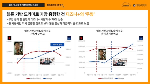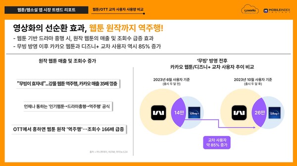 ‘무빙’ 방영 이후 ‘카카오웹툰’과 ‘디즈니플러스’의 교차 사용자가 출시 이전 기준 약 85% 증가한 26만가량으로 늘어났다. 웹툰 기반 드라마 흥행 시 원작 웹툰 조회수도 급증하는 양상이다.