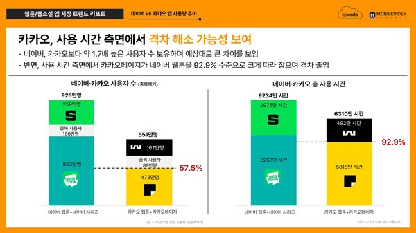 카카오는 사용 시간에서 격차 해소 가능성을 보였다. 지난 10월, 네이버 웹툰 및 네이버 시리즈의 합산 월간 사용자 수(중복제거)는 약 925만명으로 카카오 웹툰 및 카카오페이지의 합산 사용자 수(중복제거) 보다1.7배가량 많았다.