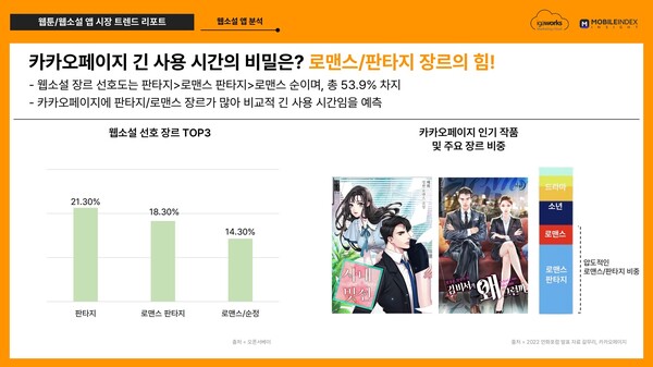 웹소설 장르 선호도는 판타지(21.30%), 로맨스 판타지(18.30%), 로맨스/순정(14.30%) 순으로, 총 53.9%를 차지했다. (출처, 오픈서베이) ‘카카오페이지’에 판타지 및 로맨스 장르가 많아 비교적 긴 사용 시간을 보이는 것으로 예상된다. (출처, 2022 만화포럼 발표 자료 및 카카오페이지)