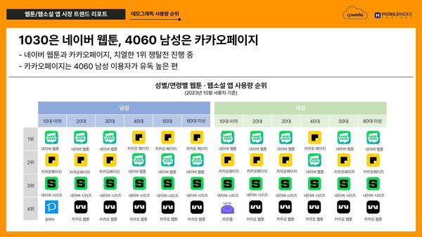 성별, 연령별로 웹툰과 웹소설의 앱 사용량을 분석한 결과, 10~30대에서는 네이버웹툰의 사용량이 높았고, ‘카카오페이지’는 40~60대 남성 이용자의 비중이 높게 나타났다.