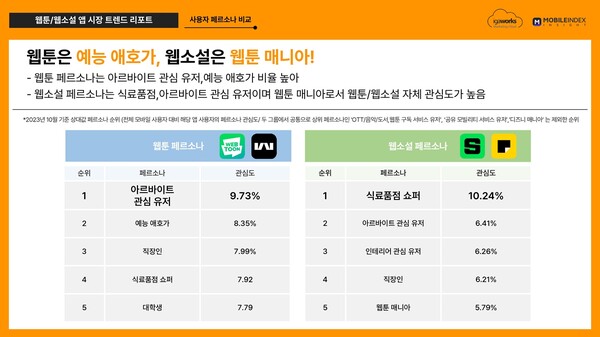 사용자 페르소나를 비교 분석한 결과, 웹툰의 경우 ‘아르바이트 관심 유저’와 ‘예능 애호가’ 페르소나가 특징적으로 나타났다. 웹소설은 ‘식료품점 쇼퍼’, ‘아르바이트 관심 유저’ 페르소나의 관심도가 높게 나타났다.