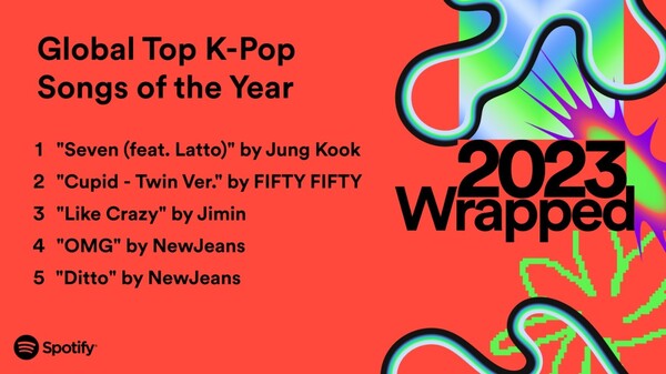 아울러, 스포티파이는 랩드 캠페인의 일환으로 올해 전 세계적으로 가장 많이 스트리밍된 K팝 아티스트 및 음원을 공개했다. 글로벌 최다 스트리밍 K팝 아티스트로는 작년에 이어 방탄소년단(BTS)과 블랙핑크(BLACKPINK)가 각각 1위와 2위를 지켰으며, 지난 3일 솔로 앨범 ‘GOLDEN’을 발매한 정국(Jung Kook)이 3위에 이름을 올렸다. 뉴진스(NewJeans)는 4위를 차지하며 새롭게 10위권에 안착했으며, 이어 스트레이 키즈(Stray Kids)가 5위를 기록했다. 또한, 전 세계적으로 최다 스트리밍된 K팝 음원 1위는 정국의 “Seven (feat. Latto)”으로, 해당 곡은 글로벌 최다 스트리밍 음원 전체 순위에서 4위를 달성하기도 했다.