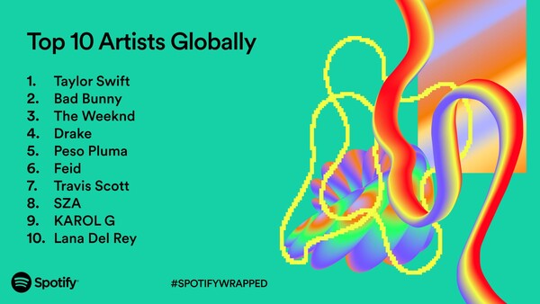 한편, 스포티파이는 이번 랩드를 통해 올해 최다 스트리밍을 기록한 글로벌 아티스트, 음원, 앨범 및 팟캐스트 등도 공개했다. 올해 전 세계에서 가장 많이 스트리밍된 아티스트는 테일러 스위프트(Taylor Swift)였으며, 배드 버니(Bad Bunny), 위켄드(The Weeknd), 드레이크(Drake), 페소 플루마(Peso Pluma)가 2위~5위로 뒤를 이었다. 최다 스트리밍을 기록한 글로벌 음원 1위는 마일리 사이러스(Miley Cyrus)의 “Flowers”이었으며, SZA의 “Kill Bill”과 해리 스타일스(Harry Styles)의 “As It Was”가 각각 2위와 3위를, 정국의 “Seven (feat. Latto)”이 4위를 차지했다.