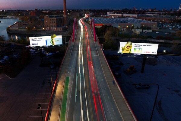 이 캠페인에는 옥외 광고 및 소셜 캠페인도 진행한다. 시카고의 두 광고판은 다멘 애비뉴 다리를 배경으로 한 광고판에는 가이코 게코가, 다른 광고판에는 레오가 그려져 있다. "인생의 조언을 원하십니까? 그의 영화를 보세요." 한 광고판에는 게코가 고속도로 반대편을 향해 손짓하는 모습이 담겨 있다. "보험 조언을 원하세요? 그를 만나보세요." 다른 광고판에는 레오가 게코를 가리키며 말한다.