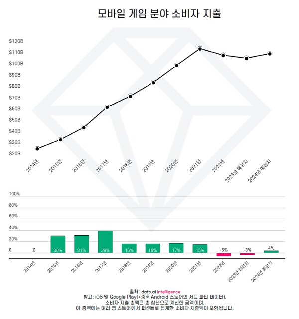 data.ai의 데이터에 의하면 2023년 게임 시장 소비자 지출은 작년 대비 3% 감소한 1,075억 달러(142.3조 원)로 전망하고 있는데 이는 높은 인플레이션, 경제 역풍 및 팬데믹 관련 시장 조정으로 인한 소비자 지갑에 대한 압박이 지속되면서 나타난 감소 추세다. 반면 2024년에는 전년 대비 4% 성장한 1,114억 달러(147.5조 원)로 반등하며 팬데믹 기간 최고치인 1,158억(153.3조 원)에 준하는 수치까지 올라갈 것으로 보인다.