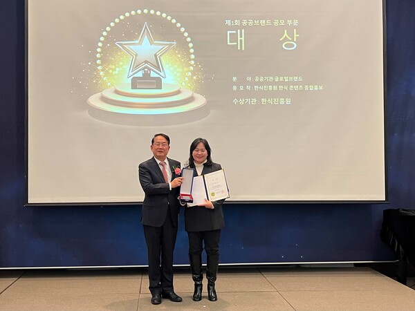 한식진흥원(이사장 임경숙)은 8일 서울 중구 한국프레스센터에서 열린 제1회 공공브랜드 대상 시상식에서 ‘한식진흥원 한식 콘텐츠 종합홍보’로 공공기관·글로벌브랜드 부문 대상을 받았다.