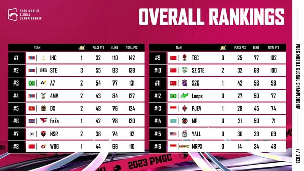 우승팀 IHC 이스포츠는 대회 1일차를 6위로 마감하며 우승과 거리가 멀어 보였다. 하지만 대회 2일차에 순위를 3위까지 끌어올리더니, 마지막 3일차에 뒷심을 발휘하며 총 142포인트로 사상 최초로 몽골의 PMGC 우승팀에 등극했다.