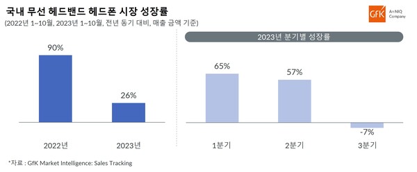 글로벌 가전 시장정보 기업 GfK(지에프케이)는 2023년 1월부터 10월까지의 국내 무선 헤드밴드 헤드폰 시장(판매 금액 기준)이 2022년 동기 대비 26% 성장한 것으로 나타났다고 밝혔다.