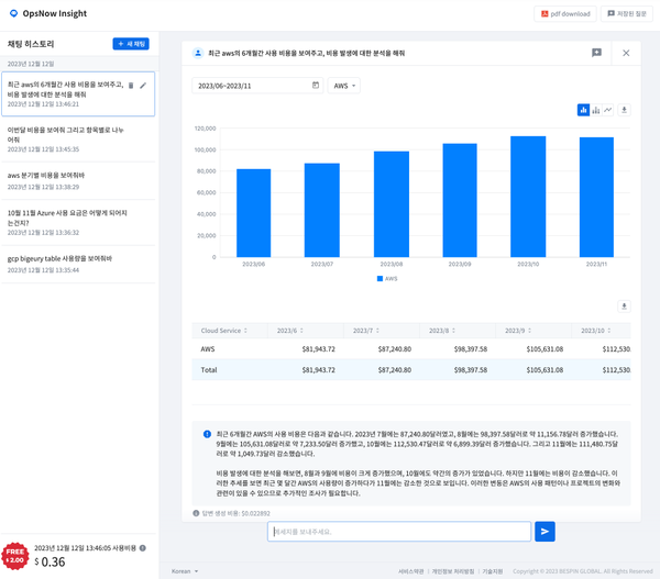 옵스나우 인사이트는 사용자가 채팅을 통해 클라우드 비용 및 자산 사용량과 관련된 다양한 데이터를 손쉽게 확인하고 분석할 수 있도록 지원한다. 사용자가 클라우드 비용 및 자산 사용량에 대해 질문하면 이를 생성형 AI를 통해 분석, 사용자의 요구에 최적화된 맞춤형 정보를 빠르고 이해하기 쉽게 제공한다.