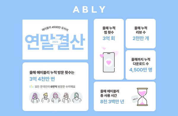 올해 에이블리 앱 누적 방문 횟수는 3억 4천만 회로, 대한민국 인구수로 환산하면 모든 국민이 1년에 인당 6번씩 에이블리를 방문한 셈이다. 12월 기준 에이블리 앱 누적 다운로드 수는 4,500만 회를 기록했으며, 연간 앱 사용 시간을 모두 더하면 8천3백만 년으로 나타났다.
