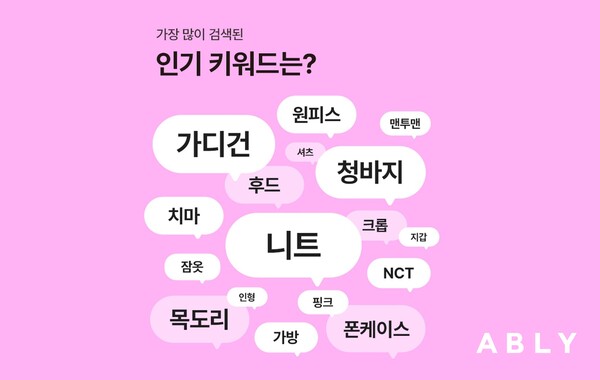 ‘NCT’ 키워드는 지난해에 이어 2년 연속 인기 검색어 상위권에 올랐다. 그룹 ‘NCT’ 콘서트 개최 소식과 함께 드레스 코드인 ‘데님’, ‘청바지’ 키워드가 함께 순위권에 랭크되기도 했다. 그룹 ‘투모로우바이투게더(TXT⋅투바투)’ 콘서트 드레스 코드 컬러로 SNS상에서 화제 됐던 ‘핑크’도 검색량이 큰 폭으로 증가했다. 단순 상품뿐 아니라 아이돌 그룹, 특정 색상 등 개인 관심사 관련 키워드를 검색하는 패턴이 관찰됨에 따라 에이블리가 기존 포털 사이트의 ‘실시간 검색어 기능’을 대체하며 ‘스타일 포털’ 역할을 하는 것으로 분석된다.
