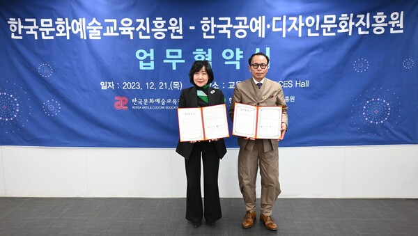 한국문화예술교육진흥원(원장 박은실, 이하 교육진흥원)은 한국공예·디자인문화진흥원(원장 장동광, 이하 공진원)과 문화예술교육 콘텐츠 프로그램 공동 개발 및 확산을 위한 업무협약(MOU)을 21일 서울 마포구 상암동에 위치한 교육진흥원 본원에서 체결했다.