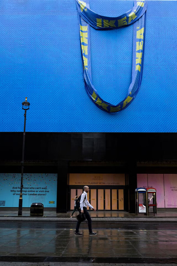 영국 옥스퍼드 스트리트에 커다란 이케아의 상징적인 파란 프락타 백이 나타났다.