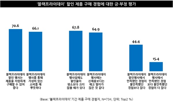 물론 다른 일각에서는 할인 행사임에도 할인율이 평소보다 크지 않을 때가 많고(67.8%, 동의율) 신제품이나 인기 제품보다는 재고 떨이 제품이 대다수(64.9%)라는 점을 지적하는 목소리도 상당했다. 평소보다 과소비를 하게 된다(51.6%, 동의율)는 부정적인 인식도 적지 않았으나, 그럼에도 대체로 블랙프라이데이 행사에 대해선 만족했던 경험이 좀 더 많은 편이었다.