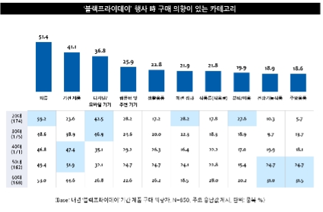 이에 따라 전체 응답자의 대다수(85.0%)는 향후에도 블랙프라이데이 기간에 할인 제품을 구매할 의향을 밝혔으며, 오프라인보다는 온라인 채널을 선호(60.6%, 동의율)하는 것으로 나타났다. 제품 항목 중에서는 주로 의류(51.4%, 중복응답), 가전제품(41.1%), 디지털/모바일 기기(36.8%) 구매 의향이 높은 편이었는데, 저연령층의 경우 패션 잡화나 뷰티 관련 카테고리에 대한 관심이 많았으며, 고연령층을 중심으로 가전제품, 건강기능식품, 주방용품 구매 의사가 높은 특징을 보이고 있었다.