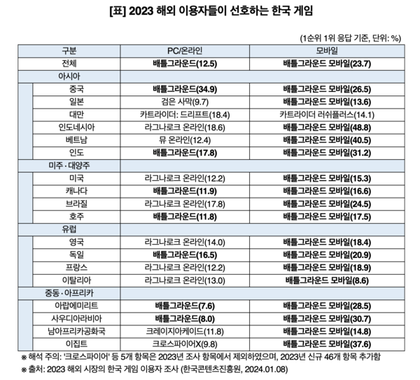 2022년 조사 보고서에서는 배틀그라운드가 PC/온라인 부문 5개국(미국, 캐나다, 영국, 인도, 카타르), 배틀그라운드 모바일이 모바일 부문 3개국(미국, 인도, 파키스탄)에서 1위를 기록한 바 있어, 특히 배틀그라운드 모바일에 대한 선호도가 크게 늘어난 것으로 분석된다. 2022년 조사는 해외 16개국 한국 게임 이용자 총 6,800명을 대상으로 진행했다.