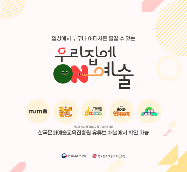 문화체육관광부(장관 유인촌)와 한국문화예술교육진흥원(원장 박은실, 이하 교육진흥원)은 국민 누구나 온라인에서 쉽게 접할 수 있도록 예술가 및 기관과 협력하여 기획·개발한 문화예술교육 콘텐츠 <우리 집에 ON(온) 예술> 5종을 교육진흥원 공식 유튜브 채널에서 순차적으로 공개한다.