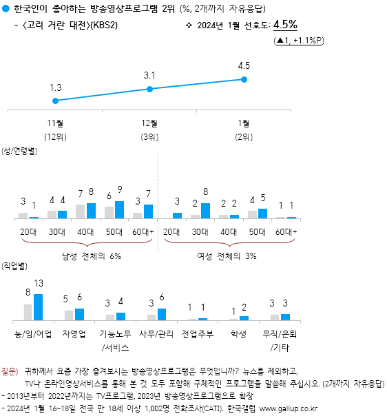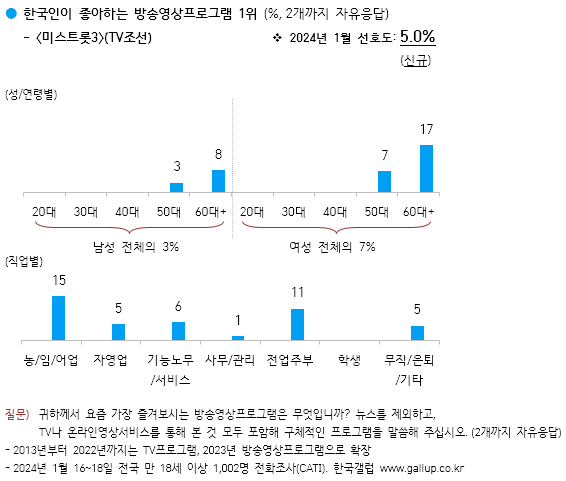 한국갤럽이 2024년 1월 16~18일 전국 만 18세 이상 1,002명에게 요즘 가장 즐겨보는 방송영상프로그램을 물은 결과(2개까지 자유응답), TV조선의 트로트 오디션 프로그램 〈미스트롯3〉이 선호도 5.0%로 1위를 차지했다.