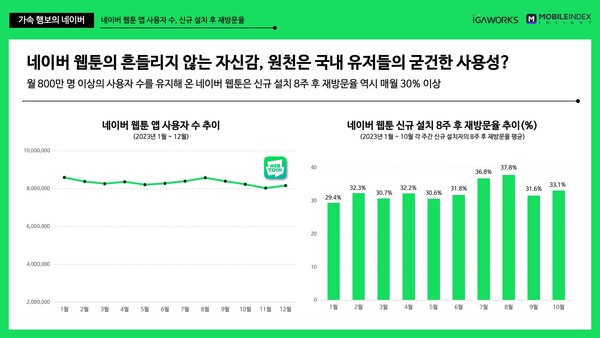 ‘네이버 웹툰’의 월간 사용자 수(MAU)는 2023년 한 해 동안 약 800만 명대 이상을 유지해왔다. 신규 설치 후 8주 후 재방문율도 평균 30% 이상인 것으로 확인됐다.