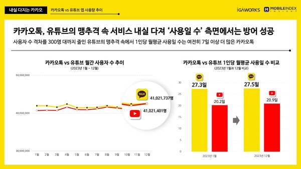 카카오톡’과 ‘유튜브’ 월간 사용자 수(MAU)의 추이를 비교 분석한 결과, 2023년 12월 두 앱 사용자 수의 격차는 약 300명대로 줄었다. 1인당 월평균 사용일 수에서는 ‘카카오톡’이 여전히 ‘유튜브’ 보다 약 7일 이상 우위를 보였다.