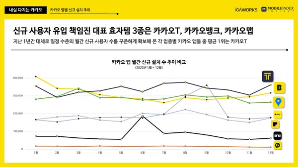 카카오의 모바일 앱 중 ‘카카오 T’, ‘카카오뱅크’, ‘카카오맵’이 많은 월간 신규 설치 수를 기록한 서비스로 확인됐다. ‘카카오페이’, ‘카카오페이지’, ‘카카오 웹툰’, ‘카카오TV’, ‘카카오게임’ 순으로 뒤를 이었다.