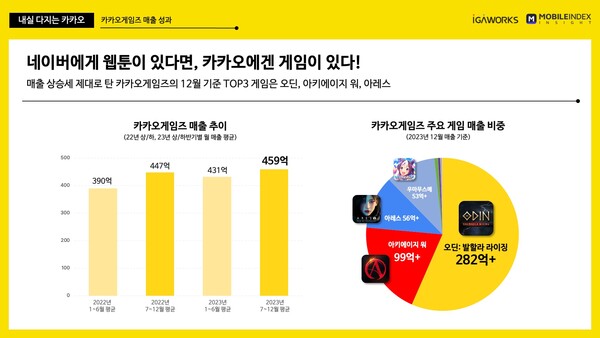 2022년 및 2023년 상/하반기 월 매출 평균을 분석한 결과, ‘카카오게임즈’의 매출은 꾸준히 상승하고 있었다. 지난해 12월 기준, 카카오게임즈 주요 게임 매출 비중은 ‘오딘: 발할라 라이징’(282억원 규모)이 가장 높게 나타났다.