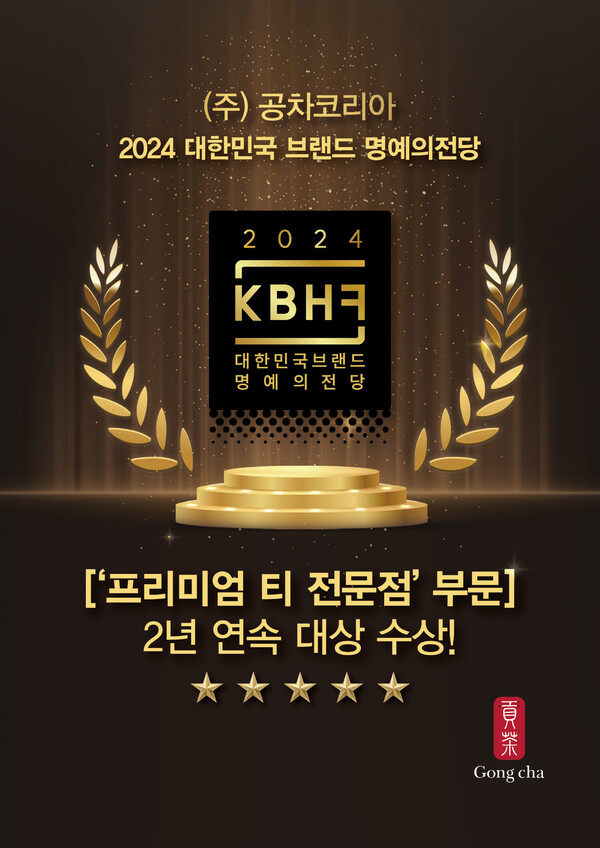 글로벌 티(Tea) 음료 전문 브랜드 공차코리아가 '2024 대한민국 브랜드 명예의전당 '프리미엄 티 전문점부문에서 2년 연속 1위에 선정됐다고 25일 밝혔다.