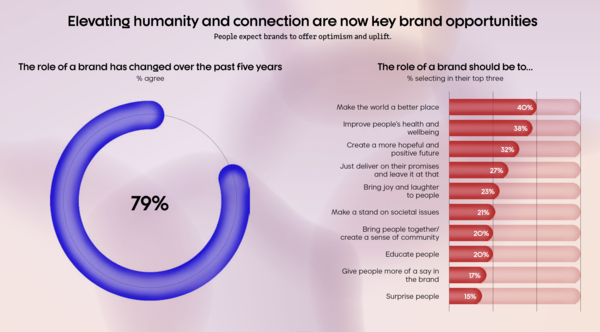 이 새로운 패러다임에서 가장 성공적이고 빠르게 성장하는 브랜드는 사람들이 구매하는 브랜드와 정서적 교감을 추구하기 때문에 연결된 브랜드이다. <더 퓨처 100: 2024>를 위해 독점적으로 수집된 데이터에 따르면, 79%의 사람들이 '지난 5년 동안 브랜드의 역할이 변화했다'고 생각하며, 브랜드의 3대 역할로 '세상을 더 나은 곳으로 만들기'(40%), '사람들의 건강과 웰빙을 개선'(38%), '더 긍정적이고 도움이 되는 미래를 만들기'(32%)를 꼽은 것으로 나타났다.