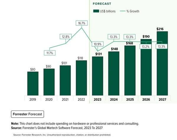 포레스터의 <Global Martech Software Forecast, 2023 – 2027> 보고서에 따르면, 지난해 지출은 10.9% 증가했으며, 연간 성장률은 향후 몇 년간 꾸준히 13.3%까지 상승할 것으로 예상된다. 또한 전 세계 마테크 지출은 2023년 1,310억 달러에서 2027년까지 연간 2,150억 달러를 넘어설 것으로 예상된다 .