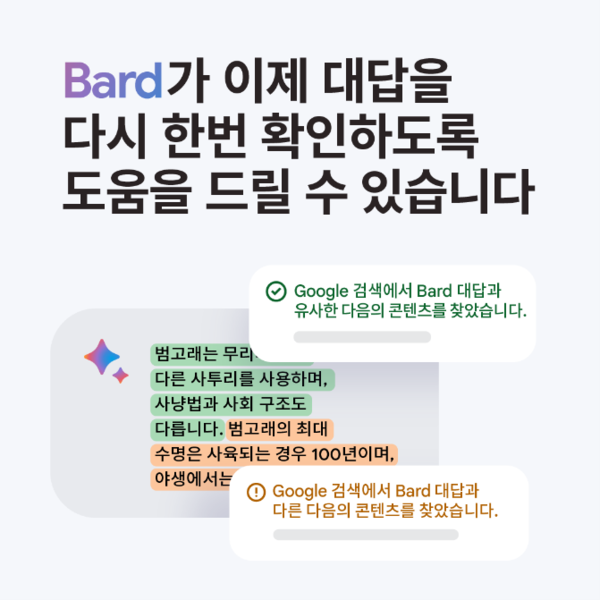 이번 제미나이 프로를 탑재한 바드를 통해 이제 한국어로도 바드의 대답을 손쉽게 다시 확인할 수 있다. 답변 하단의 구글 ‘G’ 아이콘을 클릭하면 바드가 구글 검색을 사용하여 바드의 대답과 유사하거나 다를 가능성이 있는 콘텐츠를 찾아 제공한다. 관련 내용 확인이 가능한 경우 녹색으로 강조 표시되며, 클릭하면 구글 검색 결과를 통해 더 자세히 알아볼 수 있다. 관련 내용 확인이 어려운 경우 주황색으로 강조 표시다.