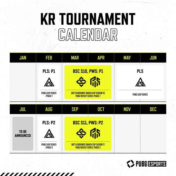 올해 배틀그라운드 e스포츠 국내 대회는 프로 대회인 ‘2024 펍지 위클리 시리즈(2024 PUBG WEEKLY SERIES, 이하 PWS)’와 전초전인 ‘배틀그라운드 스매시 컵(BATTLEGROUNDS SMASH CUP)’이 3월과 9월에 각각 2회씩 진행된다.